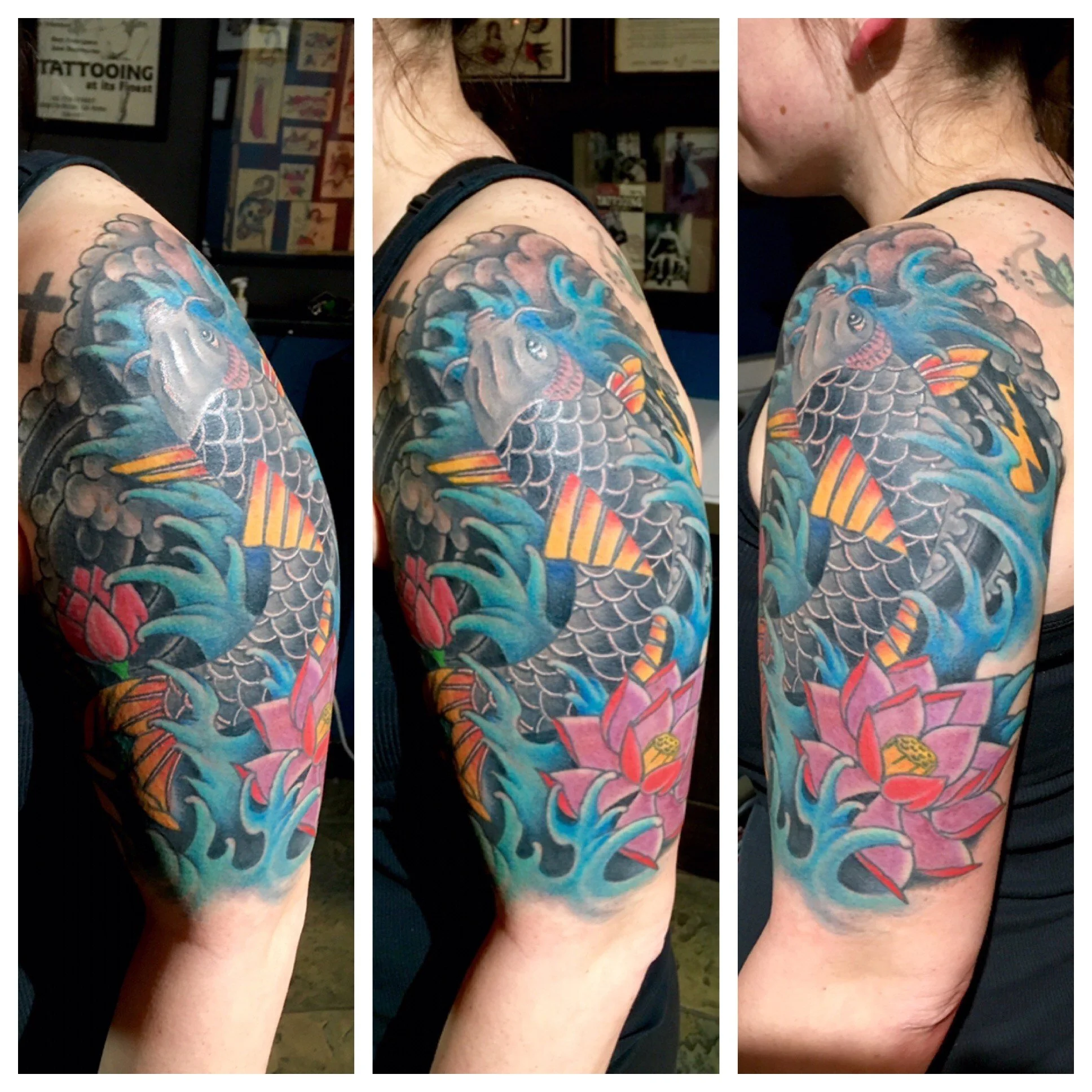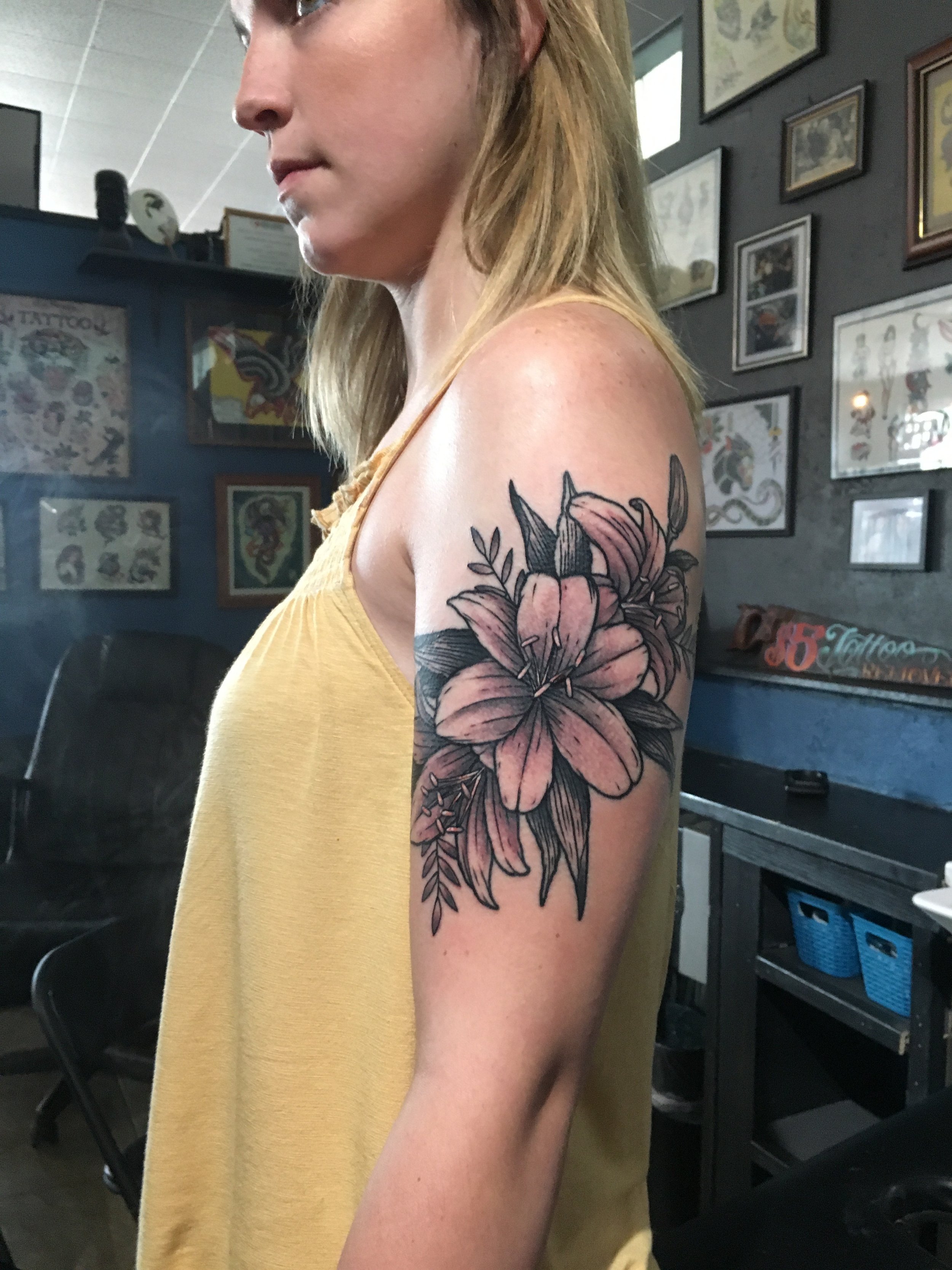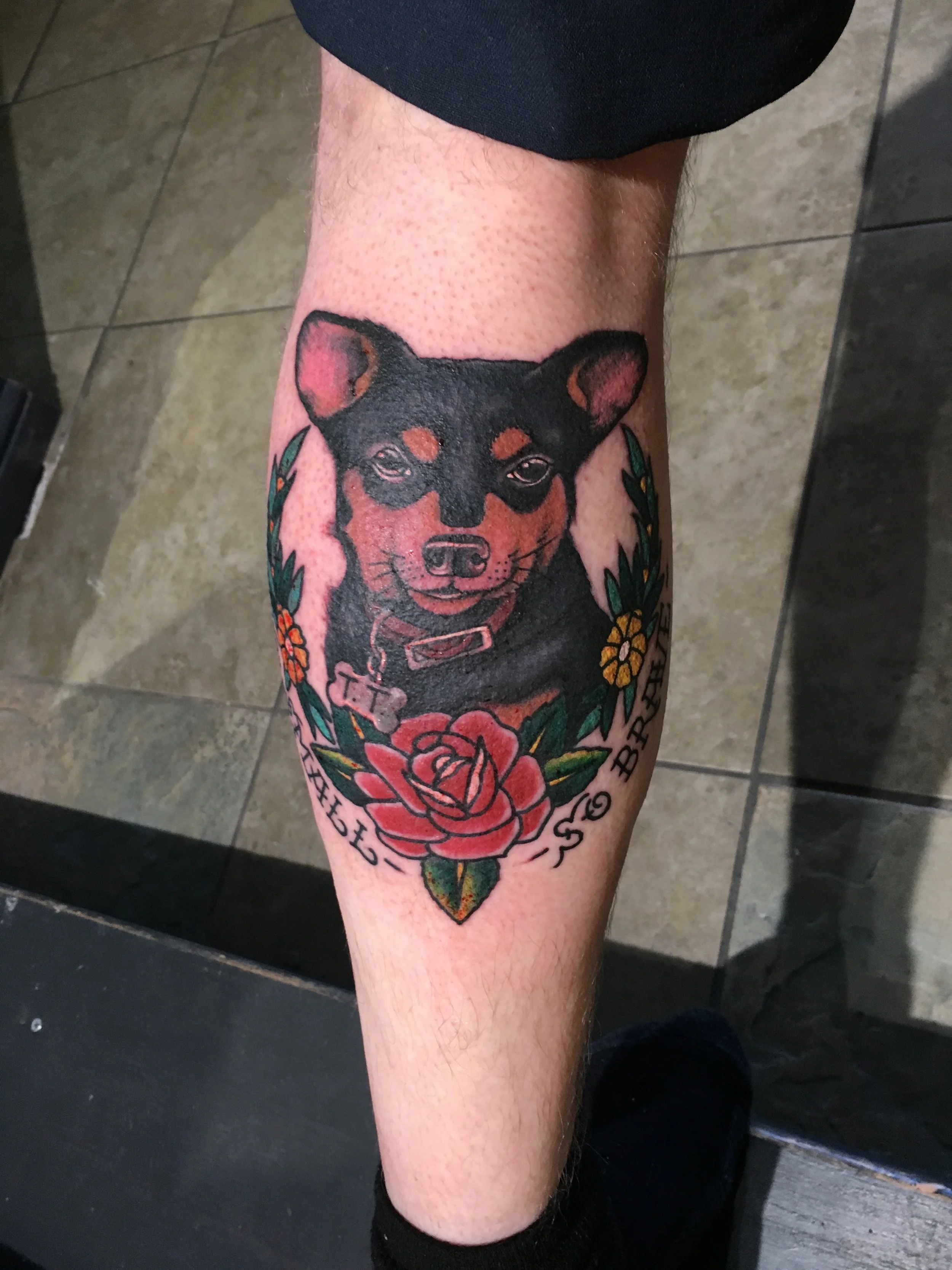 Aaron’s tattoos a combine versatility of style & long-lasting, high contrast work that suits you. Aaron LeGore has been tattooing for 14 years as of May 2024, having started his career at Hellcat Tattoo of West Palm Beach, FL. While prioritizing the look you’re after, large American traditional tattoos are as the core of his portfolio. He studied under mentors with more than a collective century of experience and combines the knowledge of generations of trade experience with the limitless boundaries of your imagination. Aaron often draws large Polynesian style, American Traditional, Tribal & background tattoos directly onto the skin, while many designs will be drawn on paper first, so you can see exactly what you’re going to get before starting. Whether you like historical American traditional tattoo flash, custom drawn tattoos in black & grey, Japanese, blackwork, minimalist, lettering, drawn by you, or tribal, Aaron is happy to meet with you any day Tuesday thru Saturday to discuss your project. Walk-ins are often possible for small work, and large work has short wait times. Aaron co-owns Calamity Jane’s Tattoo & Piercing with his wife, Jacintah Abernathy. Together with their daughter, they live with a menagerie of cats, dogs, chickens & fish; enjoy being outdoors on the Mesa or in the river, anywhere in our beautiful state; he paints traditional tattoo flash & enjoys all things tattoo history; and has seen Forrest Gump over 350 times.